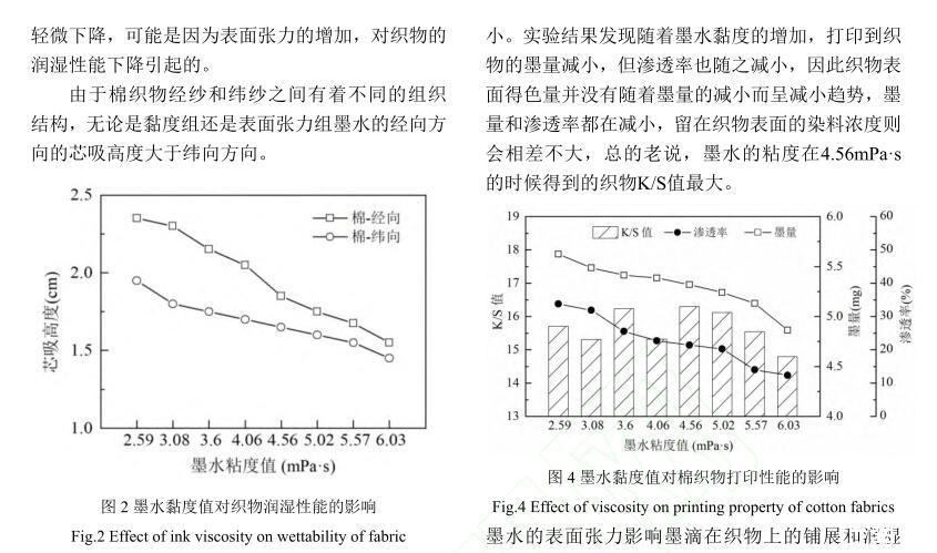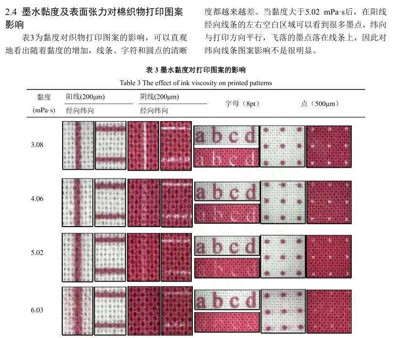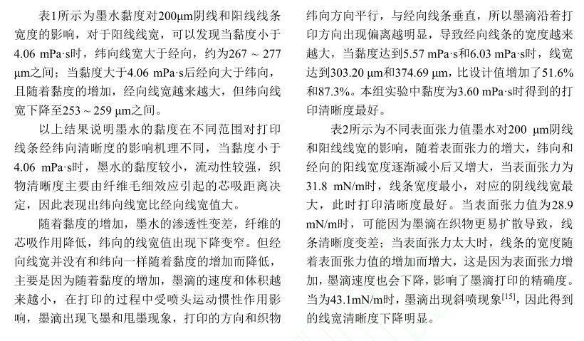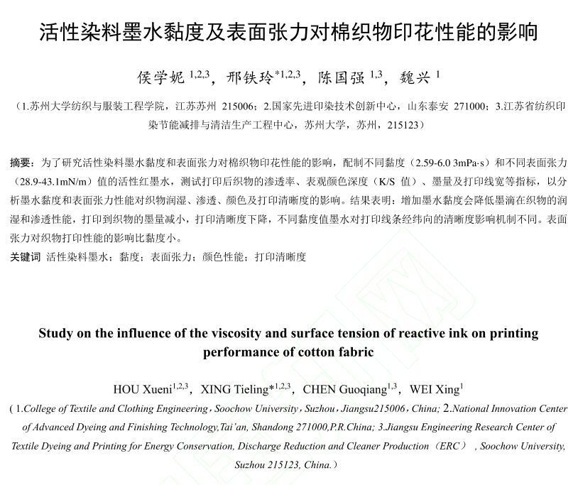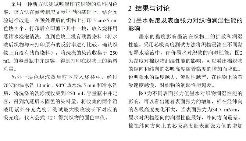 【摘要】:為了研究活性染料墨水黏度和表面張力對棉織物印花性能的影響,配制不同黏度和表面張力的活性紅墨水,測試打印后織物的滲透率、K/S值、墨量及打印線寬等指標。結果表明:提高墨水黏度會降低墨滴在織物上的潤濕和滲透性能,打印到織物的墨量減少,打印清晰度下降。不同黏度的墨水對打印線條經緯向的清晰度影響機制不同,表面張力對織物打印性能的影響比黏度小。