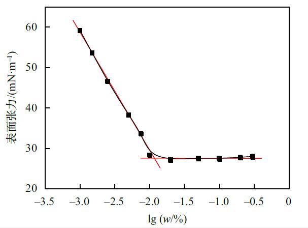 選擇陰離子-非離子表面活性劑復配體系,以十二烷基硫酸鈉(SDS)和烷基糖苷(APG)復配組分作為實驗對象,質量比為1:1。實驗結果見表2。試樣的表面張力曲線圖如圖2所示。