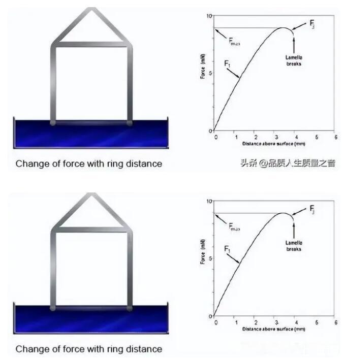 由于距離不同表現(xiàn)出的表面張力也不同,因此測(cè)量往往取最大值,也就是右方圖中的Fmax