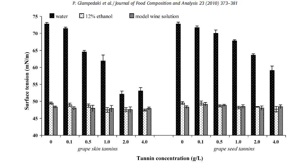 在單寧標(biāo)準(zhǔn)水溶液的情況下,從圖 1 中可以明顯看出,與葡萄籽單寧相比,葡萄皮單寧引起的表面張力降低更大。 觀察到葡萄皮單寧比葡萄籽單寧更具表面活性,部分原因可能是前者具有更高的聚合度,因此比后者更疏水(Poncet-Legrand 等,2003;Crespy, 2006)。 在其他兩個(gè)溶液系列(水醇和模型酒)中,乙醇的存在再次增加了表面張力值,而單寧的添加進(jìn)一步降低了表面張力僅 1.5 mN/m(與具有表面張力的相應(yīng)對(duì)照溶液相比)分別等于 49.5 和 48.3 mN/m)。 觀察值與書目數(shù)據(jù)一致,給出的表面張力等于 48.4 ? 12% (v/v) 的葡萄籽單寧乙醇溶液為 0.05 mN/m(Poncet-Legrand 等,2003)。 此外,相同的參考文獻(xiàn)提到濃度高于 1 g/L 時(shí)會(huì)形成葡萄單寧分子的膠體聚集體,這為最后三種標(biāo)準(zhǔn)溶液(1.0、2.0 和 4.0 g)獲得的相似表面張力值提供了可能的解釋。單寧/L)的水醇和模型酒系列。
