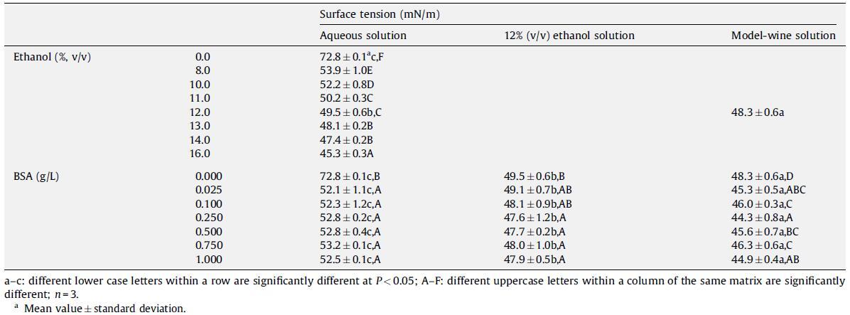 關(guān)于 BSA 溶液,觀察到表面張力值的顯著變化。 隨著 BSA 含量的增加,不僅在同一基質(zhì)內(nèi)發(fā)現(xiàn)差異,而且在三種不同基質(zhì)之間也存在差異(表 1)。 正如預(yù)期的那樣,所使用的白蛋白表現(xiàn)出很強(qiáng)的表面活性,并導(dǎo)致溶液表面張力顯著降低,測(cè)得的最低值 (44.3 mN/m) 是含 0.250 g BSA/L 的模型酒溶液的值。