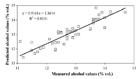 為了測(cè)試乙醇預(yù)測(cè)模型,我們分析了第二組 30 個(gè)葡萄酒樣品。 所提出的線性模型預(yù)測(cè)的值與葡萄酒酒精度等級(jí)的測(cè)量值的圖如圖 3 所示。更新的模型解釋了 81.3% 的乙醇含量變化,而現(xiàn)在估計(jì)的標(biāo)準(zhǔn)誤差為 0.36 % (v/v)。 盡管必須進(jìn)一步優(yōu)化,但該統(tǒng)計(jì)工具為文獻(xiàn)中現(xiàn)有的那些提供了一種額外的方法,用于簡(jiǎn)單快速地估計(jì)靜止葡萄酒的酒精等級(jí)(Rocchia 等,2007a,b)。