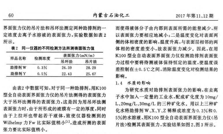 【摘要】:通過分析實驗室測定助排劑表(界)面張力的原理,確定了檢測助排劑表(界)面張力時的5種影響因素:檢測儀器、檢測方法、檢測溫度、水質、煤油介質;根據5種因素的作用機理,提出了K100型全自動表面界面張力儀操作過程中的注意事項,為準確檢測助排劑的表(界)面張力提供經驗規律。