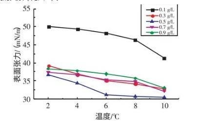2.2.1不同溫度下十二烷基苯磺酸鈉溶液表面張力與濃度的關系實驗研究了在溫度為2、4、6、8、10℃條件下,SDBS溶液的表面張力與濃度的關系(見圖3)。由圖3可知,當濃度在0.1~0.7 g/L時,隨著SDBS溶液濃度的升高,其表面張力逐漸減小;當濃度在0.7~0.9 g/L時,隨著SDBS溶液濃度的升高,其表面張力逐漸增大。當SDBS溶液濃度為0.7 g/L時,其表面張力取得最小值。