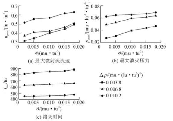 不同表面張力和初始空化泡內外壓差條件下空化泡最大微射流流速、壓力和潰滅時間變化規(guī)律如圖3所示。隨著初始內外壓差增大,不同表面張力條件下空化泡潰滅產(chǎn)生的最大微射流流速、最大潰滅壓力均隨之增大,但潰滅時間則隨之減小。初始空化泡內外壓差為0.003 8 mu/(lu·tu2)時,當表面張力由0.001 9 mu/tu2增加到0.018 3 mu/tu2,最大微射流流速增加了55%,最大潰滅壓力增加了74%。初始空化泡內外壓差增加到0.010 2 mu/(lu·tu2)時,空化泡潰滅最大微射流流速僅增加了22%,潰滅壓力僅增加了6%,最大微射流流速和最大潰滅壓力增加幅度均隨著空化泡初始內外壓差的增加而減小,說明空化泡初始內外壓差的增加會減小表面張力對潰滅過程的影響。