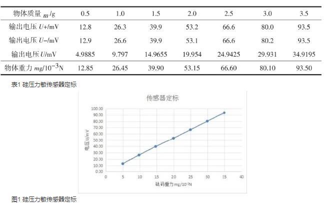 為了減小人為誤差,對于力敏傳感器的靈敏度的測量采用先依次增加砝碼片個數,測出相應電壓用U+表示,再依次減小砝碼片個數,測出相應電壓用U-表示,然后再將電壓取平均值。測量數據如下,太原地區的重力加速度為9.7970 m/s2。由圖1得傳感器的靈敏度為B=2.6792 V/N,線性相關系數R2=0.9999。
