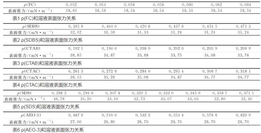 按照實驗方法Hz制備表面活性劑溶液,在室溫下,測定FC、CTAB、CTAC、SDS、SDBS和AEO-3表面活性劑的表面張力,確定CMC,結果見表1~6。